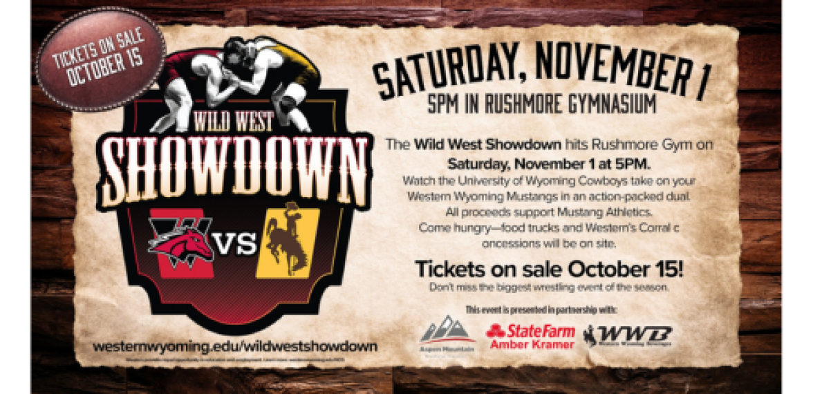 Wrestling fans, mark your calendars! Western Wyoming Community College (Western) will be hosting the first wrestling dual, the Wild West Showdown, against the University of Wyoming (UW) Cowboys on Saturday, November 1. There are only 1,100 tickets for this event with box office sales opening October 15. Tickets are non-refundable and will be available in three areas: VIP mat side, lower-section, and upper general admission. VIP tickets, which are limited, will be $50 and include a meet and greet with wrestlers, along with a complementary charcuterie board and beverages. Lower-section tickets are $20 and upper general admission tickets will be $15. Wheelchair seating is available for lower-section tickets, but tickets are limited. Special event t-shirts are for purchase at just $20. Grab your shirts on event day—pay easily with cash or card.
